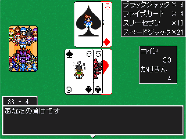 ツクール 2016/08/07 もしモン2製作記その9 イベント関係も一段落ついたので前に言ってたブラックジャックを作りました。 そこまで本格的なものでは無く、ヒット、スタンド、ダブルのみのシンプルなものです。 カジノの遊戯も随分と充実してきました。 感想掲示板を覗いてみたら、まだ配合リストを公開していないのにかなりのモンスターが作られてて驚きです。 で、まおうのむすめの配合設定が出来ていなかったようなので、先ほど修正パッチを投下してきました。ついでにブラックジャックも遊べます。 今回、一部の配合を廃人仕様にしてはいるんですが、このままだと完成版が出る前に手探りでモンスターコンプされてしまいそうですね^^; やっぱ(皆モンスターズが)好きなんすねえ~