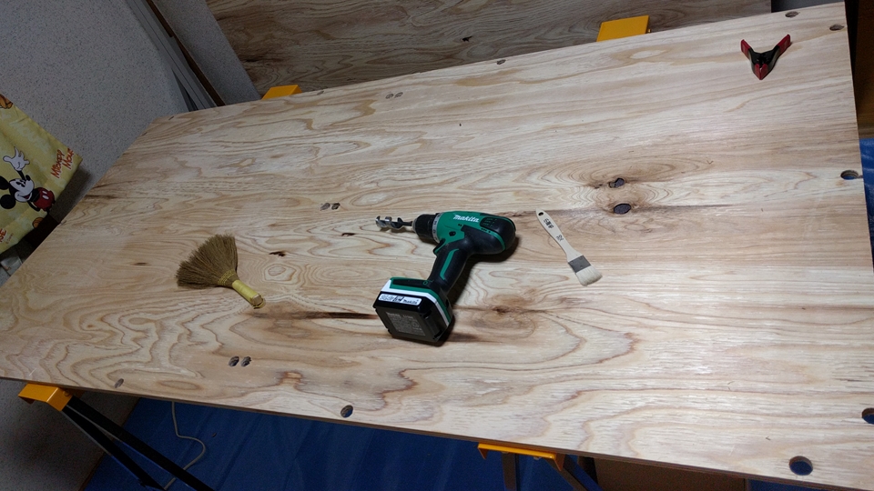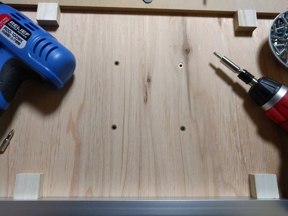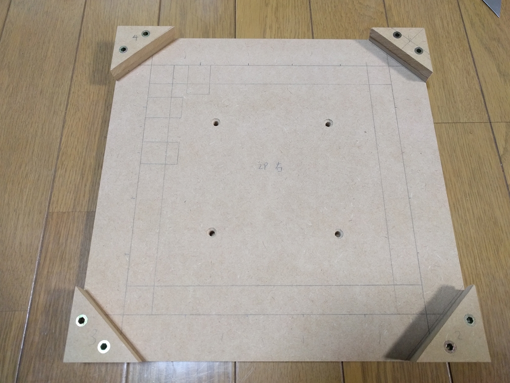 穴の位置は、後述のパネル底上げ用の木材を置く位置と被らないようにだけ気を付ければ適当な位置でOK。私は1pと2pそれぞれの端から80㎜の位置で開けました。