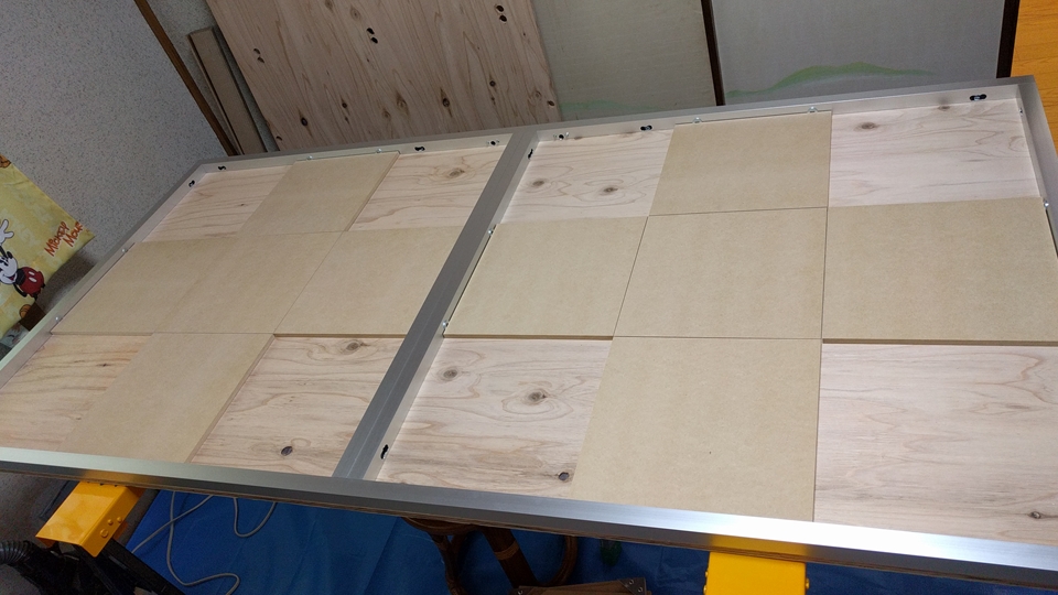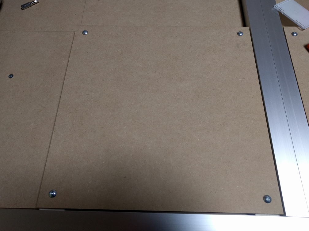 中にパネル用のMDF板が収まるよう仮置きし、合板①に角パイプを固定。