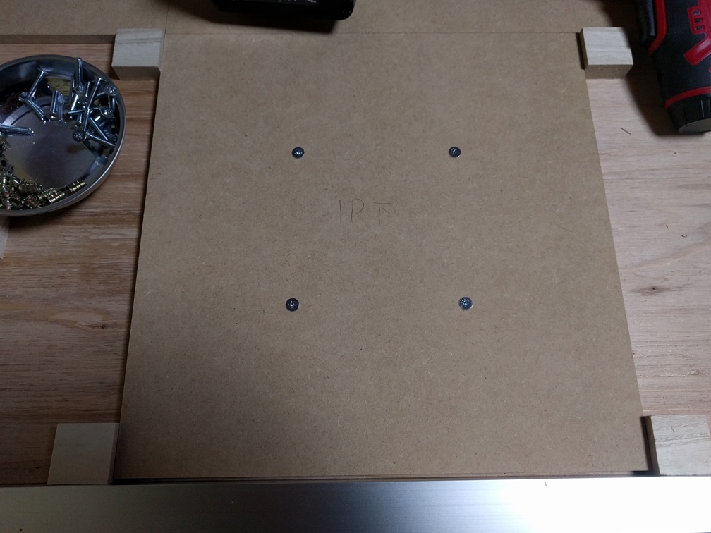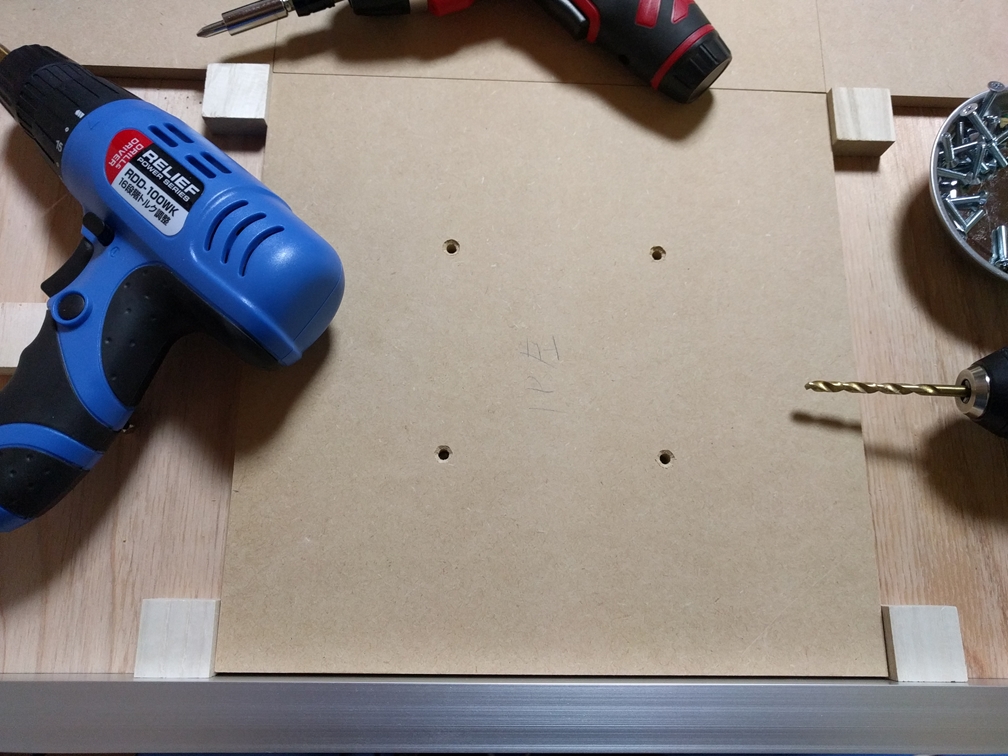 先ほどと同じような流れでMDFと底上げ木材をまとめて穴開け→鬼目ナット取り付け。
