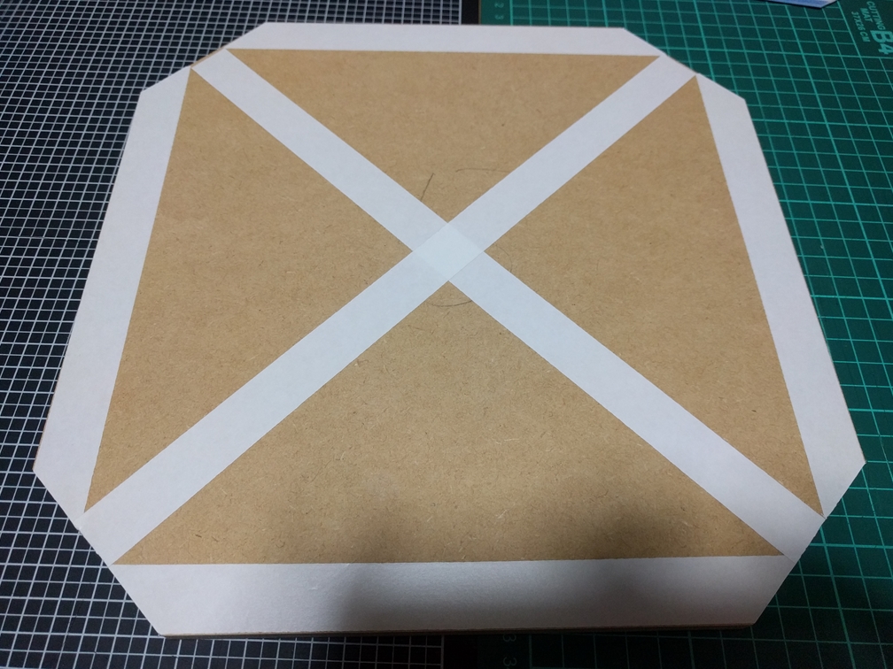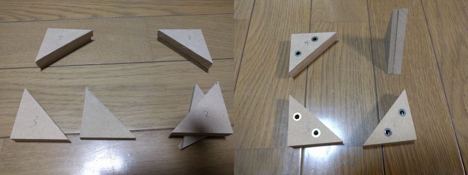 切り出したMDF板に合わせて6㎜のMDF板も50㎜三角に切ってボンドで貼り合わせ。6㎜MDF板の方がはみ出ている場合はやすりなりのこぎりで削り落とします。