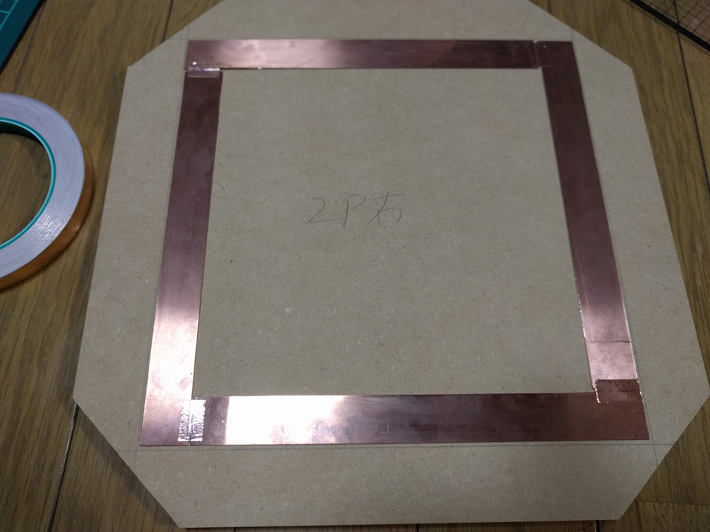 土台中心よりやや下の位置に10㎜*20㎜銅板を2枚貼る。これは導線をはんだ付けして基盤へ行く用。