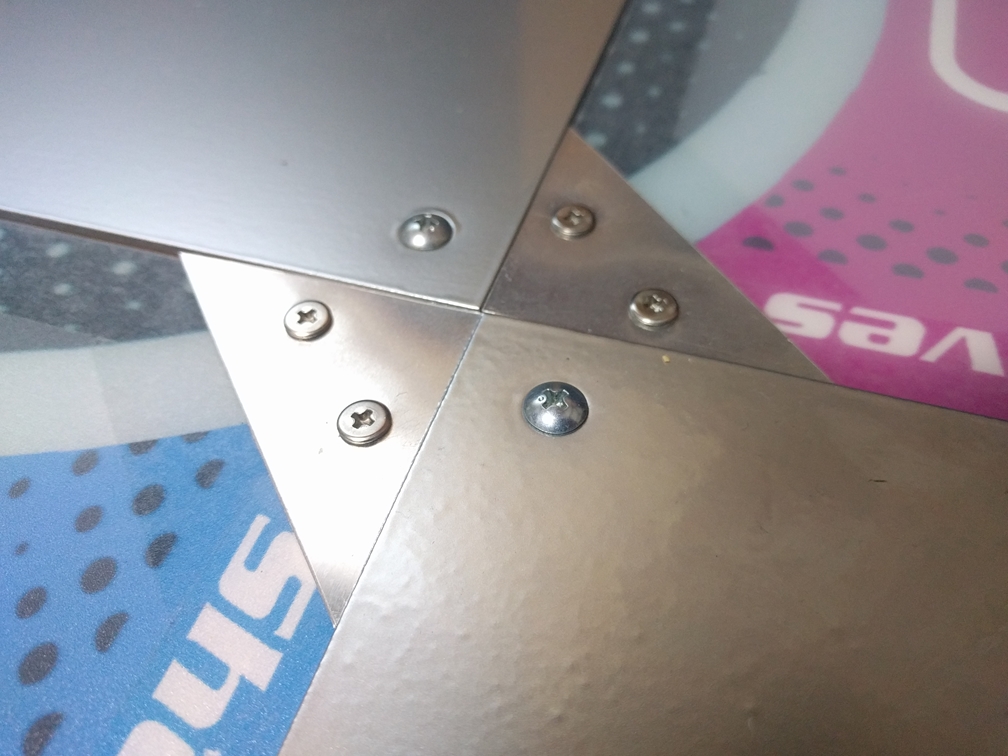 アルミ板を2辺55㎜の2等辺三角形にカッターで切り出し、5㎜の穴を2か所開ける。1パネルにつき4枚×8で計32枚。